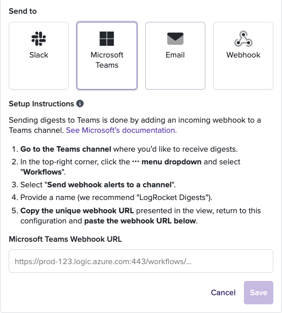 LogRocket delivers a daily or weekly Issues Digest to your Slack channel, Microsoft Teams channel, email address, or webhook endpoint of choice. The digest is a summary of your app's most severe issues from the last week. Weekly digests are delivered Monday mornings.
