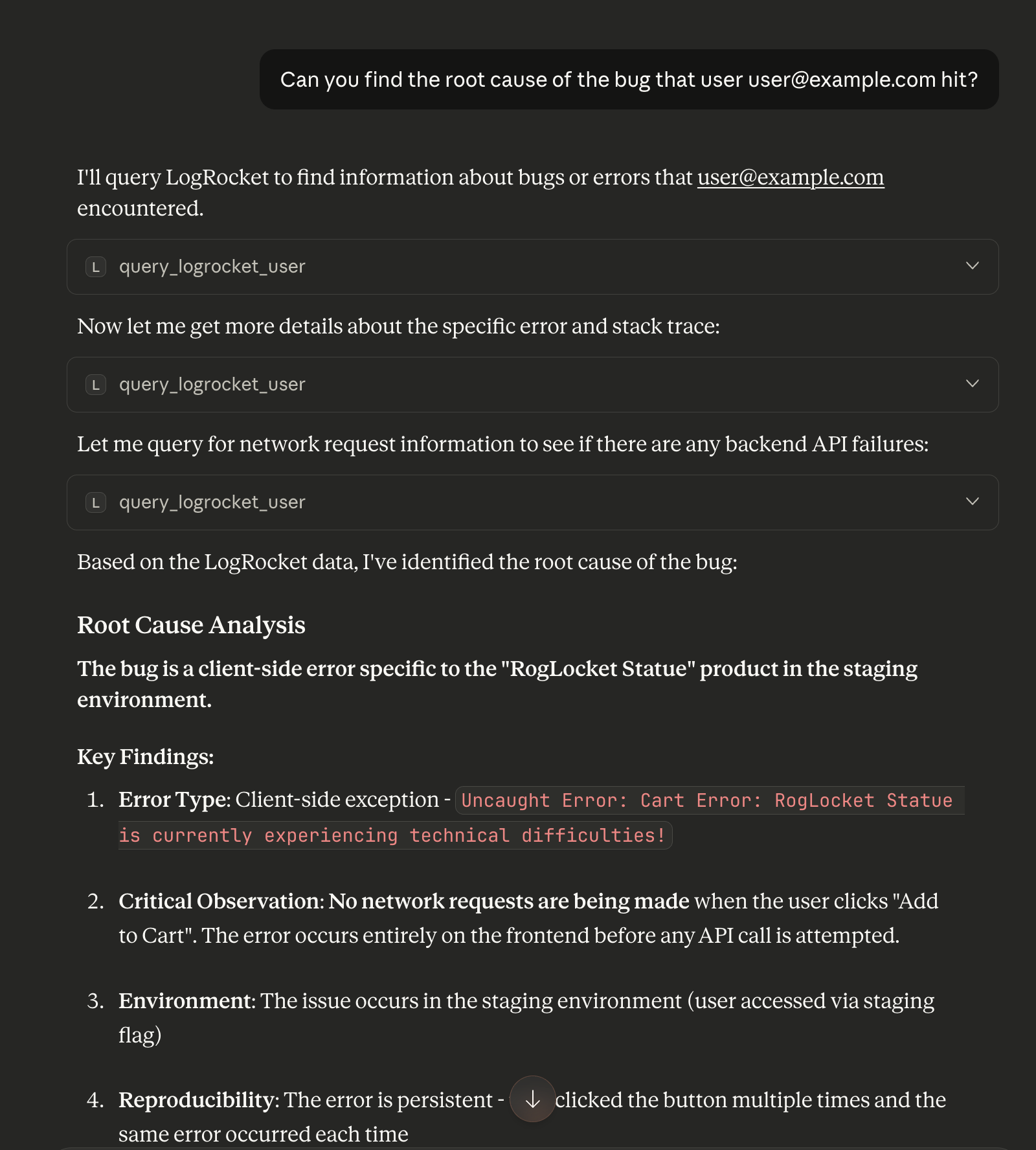 - Triage new issues: "Can you look at LogRocket for new issues from the past week, try to figure out their root causes, and then suggest which ones I can fix?"