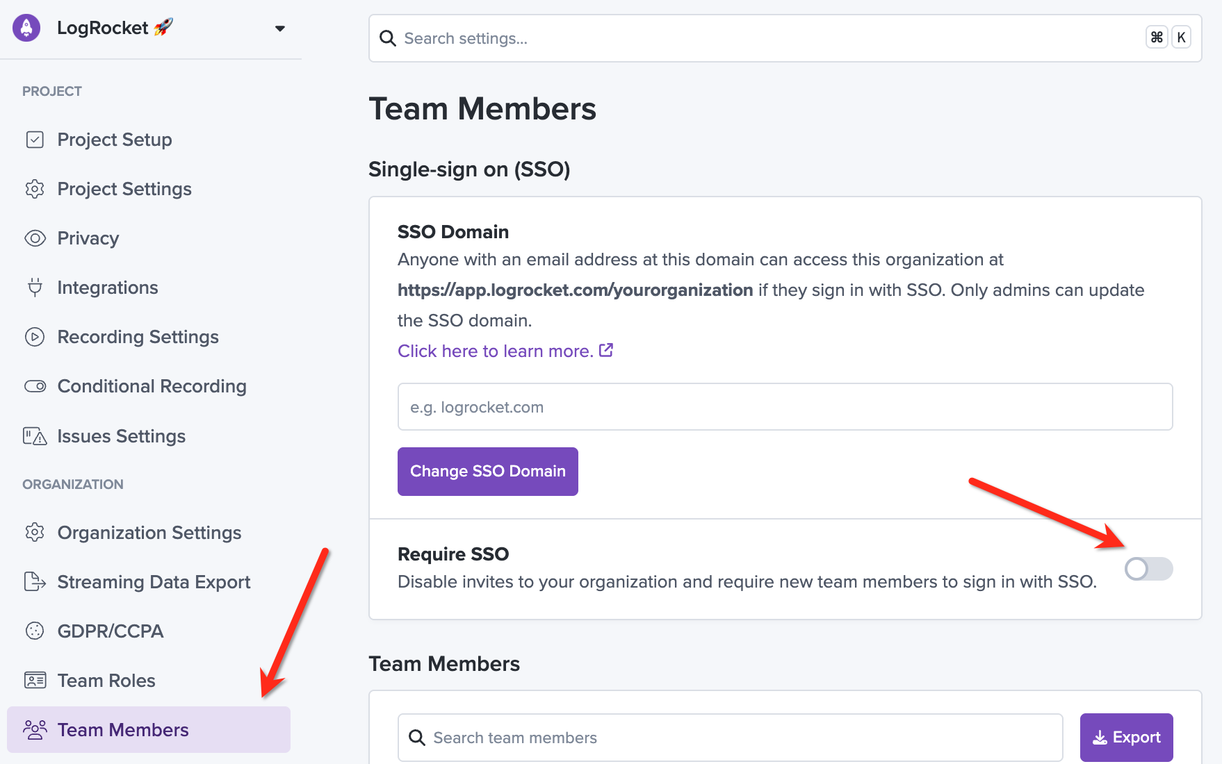 To get started, navigate to the team page in your project. Then, enter your organization's domain. Make sure to omit "https://" and/or "www"; just enter the domain (e.g., logrocket.com, example.com).
