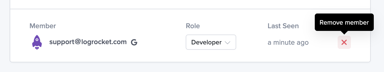 Developer: Developers can access all functional aspects of LogRocket, including playback and dashboards, but cannot delete apps or invite new members. This is the default role